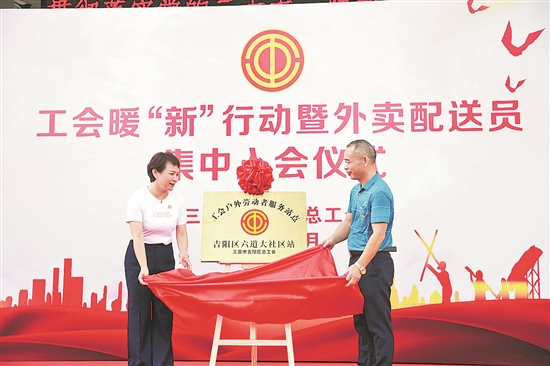 三亚市人大常委会副主任、市总工会主席符婉与吉阳区六道大社区党委书记、主任曾幸忠共同为“工会户外劳动者站点(吉阳区六道大社区站)”揭牌。