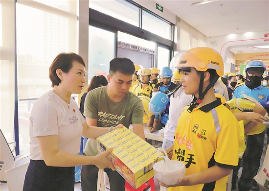 吉阳区工会暖“新”行动暨外卖配送员集中入会仪式举行,三亚市总为现场的外卖配送员发放夏季防暑降温物资。