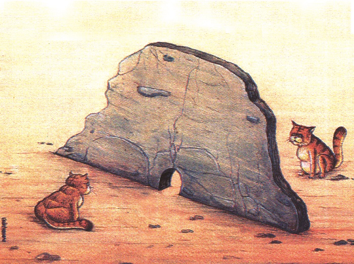 两只猫咪聚精会神地等鼠出洞,从早晨“盯”到傍晚……人们不禁要问,它们为啥不往前走一步仔细看看?唉,自信≠执着。