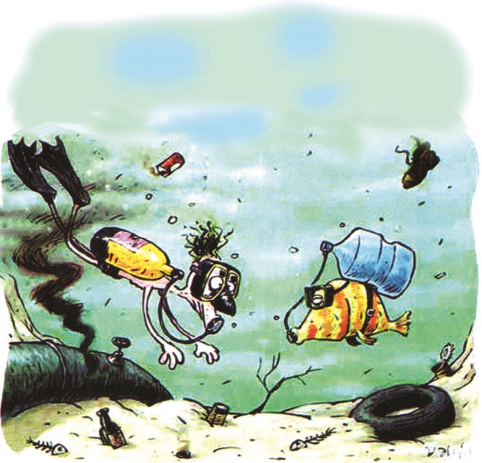 人类为了开发水资源来到海洋深处,没料到这儿也被垃圾废物等占领,鱼儿都带着防毒面具,“难兄难弟”相对无言。