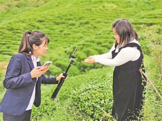 近年来,湖北交投鄂西北运营公司积极协调 616 公里管段沿线驻地政府、景区展开合作,拓宽业务领域,深化交旅融合,通过直播进行实时路况播报、普及高速行车常识、解答收费政策咨询、推介周边特色景点,实现多方合力促增收的良好局面。图为10月8日,窑淮管理所收费员在茶园中做直播介绍当地茶叶。贺永 摄