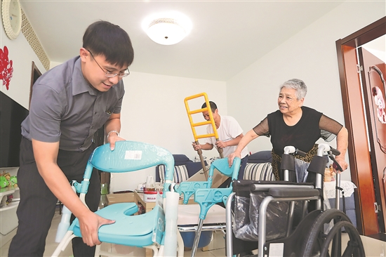 10月16日,工作人员正在天津市劳动模范冯秀文家中安装养老设备。河西区总工会启动特殊困难劳动模范居家适老化改造项目,提高80周岁以上失能、高龄、残疾的劳模和先进工作者的生活质量。本报通讯员 沈岳 摄