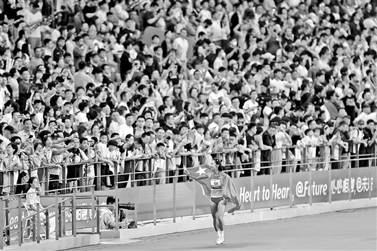 获得女子100米比赛金牌后,中国选手葛曼棋身披国旗向现场观众致意。本报记者 吴凡 摄