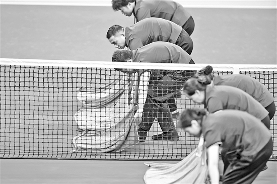 9月30日,杭州亚运会网球男子单打决赛开赛前,工作人员在清理场地。本报记者 吴凡 摄