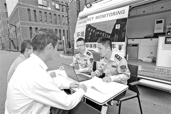 为提升和优化营商环境,9月份以来,浙江省杭州市生态环境局临安分局移动审批车投入运行,把服务“窗口”搬到企业“门口”,组织审批、土固、法规等职能科室赴企业集聚区开展上门服务,为企业办理环保审批业务,让企业少跑路,提升行政审批效率。新华社记者 徐昱 摄