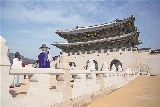 当地时间10月18日,游客在韩国首尔光化门参观拍照。