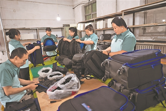 10月18日,在河北省保定市白沟新城,一家箱包公司员工对摄影包进行质检。