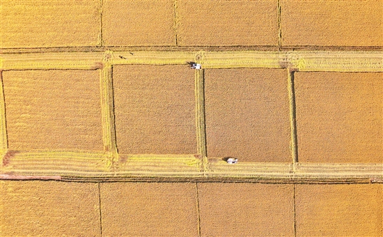 10月18日,在河北省唐山市曹妃甸区第五农场,农机手操作收割机帮助农民收割水稻(无人机照片)。