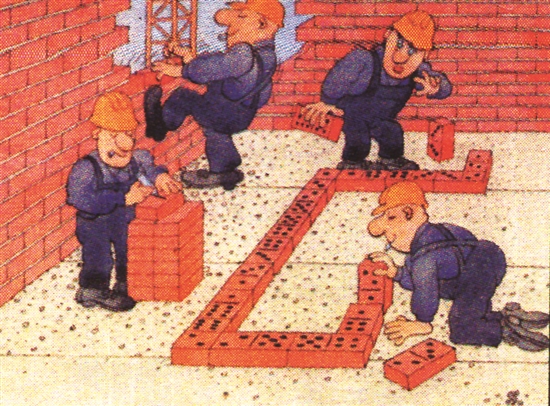这几位砌墙工一时兴起,犯了赌瘾,用现成的红砖码起“城墙”之阵。