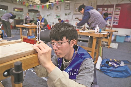当日,首届全国职工木作技艺技能大赛暨“考工杯”手工木工及家具设计竞赛在潘家园旧货市场及北京交通运输职业学院开幕。竞赛旨在推广和传承中国传统木作文化,提升手工木工的技艺水平。本报记者 刘金梦 摄