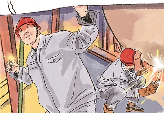 “仰焊时,火花会往下掉,动作慢的话,一个焊程烧完,皮肤上会烫出好些坑。”看着正在学习焊接技术的青工,张道旺有些心疼。说着,他搓了搓自己斑斑点点、坑坑洼洼的手臂。