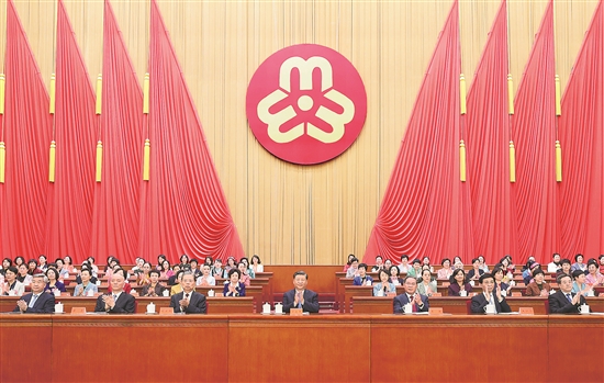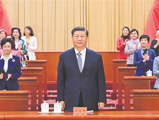 10月23日,中国妇女第十三次全国代表大会在北京人民大会堂开幕。这是中共中央总书记、国家主席、中央军委主席习近平在主席台向与会代表致意。新华社记者 谢环驰 摄