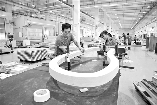 10月19日,位于江苏如皋高新区海直格(江苏)智能制造有限公司,工人们正在赶制定制家具的订单, 满足出口订单需求。徐慧 摄/中新社