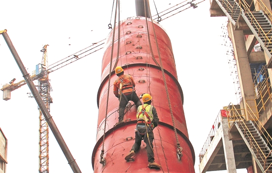 近日,中国能建葛洲坝钟祥水泥公司投资1.6亿余元对1#线进行节能降碳技改。改造完成后,水泥熟料综合能耗将达到行业标杆水平,碳排放达到环保绩效B级排放限值,可年利用替代燃料5.50万吨。图为施工人员在吊装风管上作业。张传武 摄