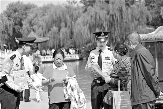 10月23日,江苏省扬州市公安局蜀冈-瘦西湖风景名胜区分局旅游警察大队民警向老年游客宣传防范养老诈骗知识。连日来,该大队立足辖区实际,组织民警走进景区,向游客宣传国家反诈中心App,讲解典型的诈骗手段,让游客在观光游览的同时,守护好自己的“钱袋子”。本报通讯员 沈冬兵 摄