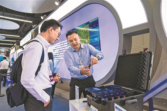 10月26日,在株洲国际会展中心,工作人员(右)向观众介绍一款应用北斗技术的可穿戴定位设备。