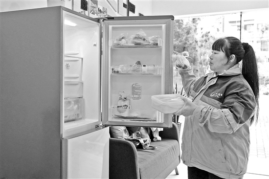 10月25日,在重庆市北碚区云清路“劳动者港湾”,一名环卫工人从冰箱内取出午饭准备加热。