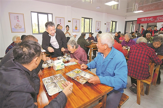 近日,浙江省诸暨市陶朱街道五蓬新村爱心食堂正式开张,全村60岁以上的老年人齐聚一堂愉快就餐。该街道近期还将有3个村的“爱心食堂”陆续开业。