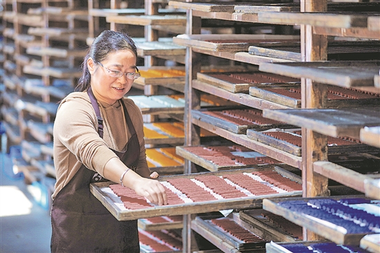 安徽省黄山市歙县老胡开文墨厂是皖南地区规模最大的徽墨工厂。2006年,徽墨制作技艺被列入首批国家级非物质文化遗产名录。多年来,墨厂积极开展校企合作,开设非遗制作技艺班,教授徽墨制作,培养年轻的从业人员,同时也不断更新技术、创新产品,通过研学游、直播、电商等推介方式,将徽墨推向世界。图为制墨工人在查看通风晾墨。