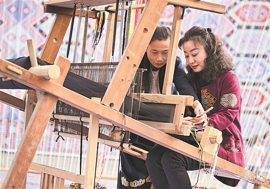 10月28日,在湖北省来凤县龙凤文化中心广场,织锦女工指导游客使用传统织锦机进行“西兰卡普”土家族织锦制作,普及非遗文化。近年来,当地围绕“西兰卡普”传统技艺打造文化旅游产品,助力乡村振兴。新华社记者 程敏 摄