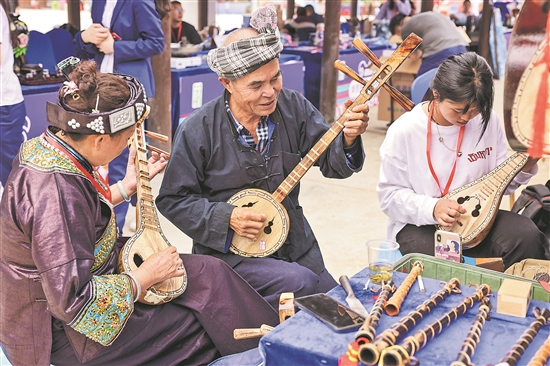 10月25日,布依族艺人在台江县球场旁搭建的非遗集市上演奏月琴。