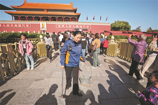 10月26日上午,北京天安门城楼前,全国劳动模范、北京环卫集团城市机扫公司天安门环境服务中心保洁员蔡凤辉正在进行地面清扫。