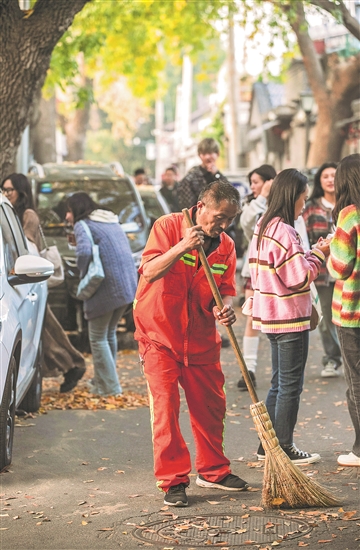 10月24日,北京北锣鼓巷,一名环卫工在人群中清扫地面。本报记者 蔚可任 摄