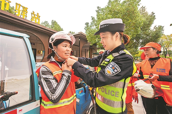 10月25日,安徽芜湖,交警向环卫工人赠送头盔并教授正确穿戴方法。本报通讯员 肖本祥 摄