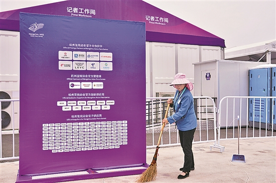 10月26日,浙江杭州,清洁工汪红花正在对亚残运会自行车公路赛场地进行清扫。本报通讯员 王鹏 摄