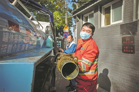 10月25日清晨,北京市东城区石板胡同,东城区环境卫生服务中心时传祥所青年班班长付晨(图右)正在进行粪井的清运工作。