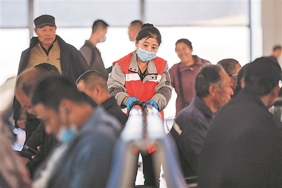 10月26日,山西太原,保洁员正在太原南站打扫候车室座椅。本报通讯员 张炯 摄