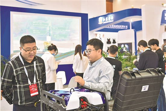 10月29日,在长沙国际会议中心,参展商(右)向观众介绍特种装备。当日,博鳌亚洲论坛全球经济发展与安全论坛第二届大会博览会在湖南长沙开幕,本次大会以“全球发展 共享安全”为主题,会期3天。新华社记者 陈振海 摄