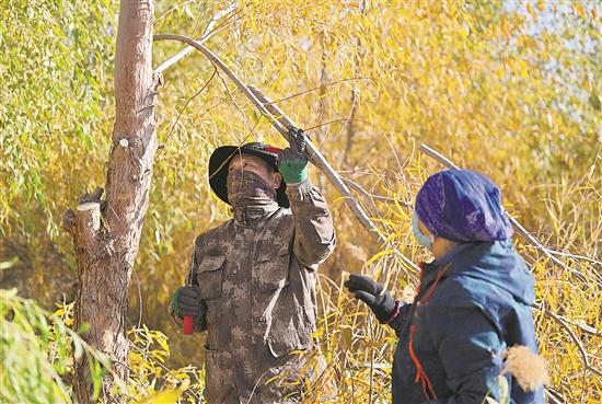 10月28日,德力格(右)和儿子苏虎庆给胡杨剪枝。苏和是内蒙古阿拉善盟退休干部,他和老伴德力格在额济纳旗黑城遗址边种下了9万棵梭梭苗。2021年,苏和老人去世。德力格和他们的孩子依然坚守在梭梭林。新华社记者 任军川 摄