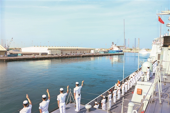 中国海军第44批护航编队结束对阿联酋的友好访问,于当地时间3日离开阿布扎比扎耶德港。新华社发 (张元虎 摄)