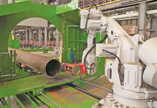 11月5日,秦皇岛经济技术开发区中石油宝世顺(秦皇岛)钢管有限公司钢管生产线的智能机械设备在工作中。