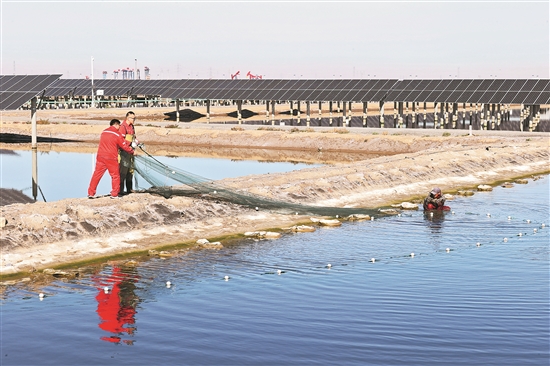 冀东油田分布式自发自用光伏发电项目是大型沿海滩涂“渔光互补”光伏项目,上层空间用于发电,地面滩涂用于水产养殖,利用“光伏+”模式极大提高了滩涂的开发和利用价值。该项目选择的养殖品有对虾、鲢鱼等,目前已到了打捞季节,“上可发电、下可养殖”的双效益模式初显成效。图为员工们在捞虾。杨军 丁青 摄