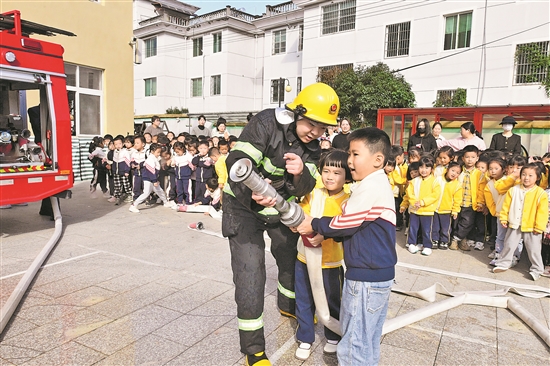 11月7日,浙江省建德市杨村桥镇消防队员给杨村桥中心幼儿园的孩子们讲解消防水枪使用方法。