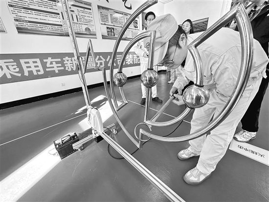 11月6日,广汽乘用车有限公司新疆分公司技术员熊雷云正在玩“火线冲击”游戏。熊雷云在不久前举办的新疆乌鲁木齐经开区安康杯汽车职业技能竞赛“火线冲击”比赛项目中夺得第一名。这台游戏装置实际上是一种培训器材,兼具娱乐性和操作性,其模拟工人实际装配场景,训练工人的身体协调能力。每名进入该企业工作的员工都需要通关这款游戏。