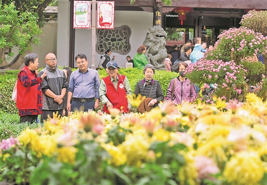 11月12日,“市民园长”陈素芬(左一)在福建福州西湖公园与市园林中心管理人员交流游客参观公园等情况。近日,福州市园林部门与市管公园的“市民园长”深入了解市民对城市园林工作的意见和建议,让公园更好造福于民。