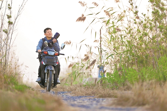 近日,韩战桥骑着摩托车在雄安新区孝义河河口湿地巡护。