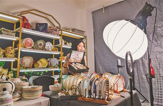 近年来,中国的“双十一”购物节走向国际,在印度尼西亚也逐渐成为潮流。位于印度尼西亚北雅加达的阿塞姆卡市场是当地知名的小商品批发市场中心,这里一家名叫“美丽珍珠商店”的小商品批发店在“双十一”购物节之际更加忙碌起来。据店主陈登升介绍,这家店铺的商品均从中国浙江、广东等地进口,非常符合印尼当地消费者的购物需求。图为“美丽珍珠商店”员工在“双十一”购物节期间直播带货。新华社记者 徐钦 摄