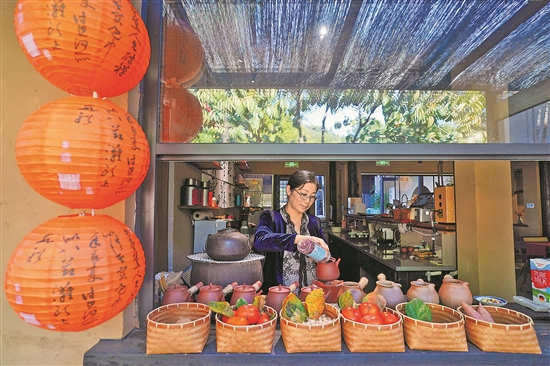工作人员在树山村的一家民宿内为游客制作茶饮(11月2日摄)。