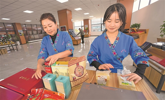 11月14日,在施秉县产业园区一家电商企业的展厅,直播平台的工作人员在整理农产品。
