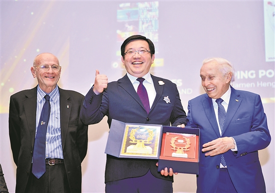 日前,2023米兰国际体育电影电视节在米兰伦巴第大区礼堂揭晓各奖项归属,中国影片《北京2022》《我们的冬奥》斩获金花环奖,另有5部作品获得提名奖。图为影片《我们的冬奥》监制、导演王诤(中)在颁奖典礼上领取金花环奖。