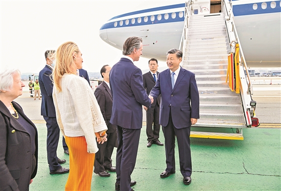 习近平乘坐专机抵达旧金山国际机场时,受到美国加利福尼亚州州长纽森、财政部长耶伦等美方代表热情迎接。