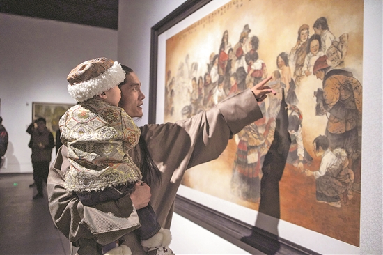 11月15日,观众在西藏美术馆参观画作《草原纪事》。
