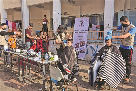 当地时间11月14日,在加沙地带南部城市拉法,志愿者为流离失所的巴勒斯坦人理发。新华社发(哈立德·奥马尔 摄)