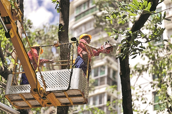 班组工人正在修剪绿化树枝叶。