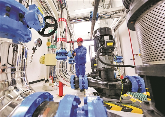 11月15日,唐山港能投智慧能源有限公司工作人员在唐山市路南区一处供热站内检查供暖设备。