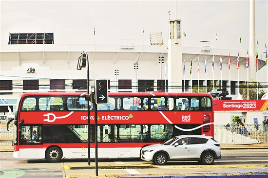 近年来,中国制造的新能源汽车不断进入智利市场,凭借绿色环保的特点和先进科技的应用广受当地民众的青睐。图为近日在智利首都圣地亚哥,一辆由中国制造的新能源公交车经过2023泛美运动会主场馆。
